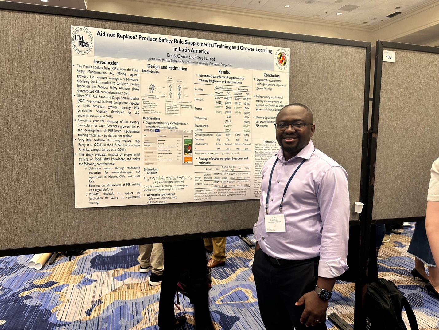 Dr. Eric Owusu presented a policy-relevant study he and Dr. Clare Narrod conducted, titled “Aid Not Replace? Produce Safety Rule Supplemental Training and Grower Learning in Latin America.” The study examined the effectiveness of supplemental training via a digital platform in enhancing knowledge of the Produce Safety Rule among Latin American growers. The main finding was that exposure to supplemental training resulted in robust increases in food safety knowledge for owners and/or managers, as well as supervisors. The implications are that mainstreaming this type of training, either as a compulsory or optional add-on to the traditional grower training, may bolster growers’ compliance capacity with the Producer Safety Rule. Additionally, a digital platform can expand flexibility in accessing training materials, which could be leveraged by training stakeholders to reach a larger clientele.