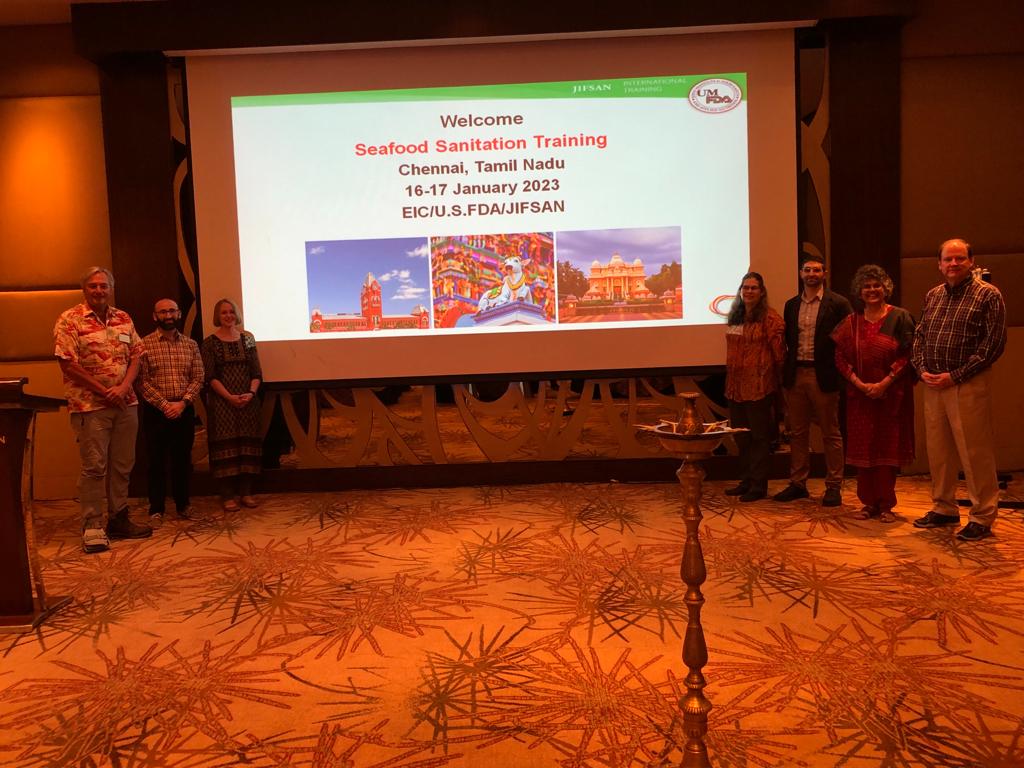JIFSAN collaborated with the Export Inspection Counsel (EIC) & The Marine Products Export Development Authority (MPEDA) to present two, 2-day Sanitation trainings in Chennai & Kochi, India on January 16-20, 2023. A total of 61 participants attended the trainings. The goal of this training is to provide a diverse field of Indian personnel with a critical overview on proper food processing sanitation methods and constructing sanitation standard operating procedures (SSOPs) to improve safety and prevent exposure to food safety hazards. The training began with an online Food Processor Sanitation Course provided by the University of Maine to introduce the course topics. The training then consisted of an in-person Sanitation course that included lectures, hands-on group activities, and student presentations and discussions.